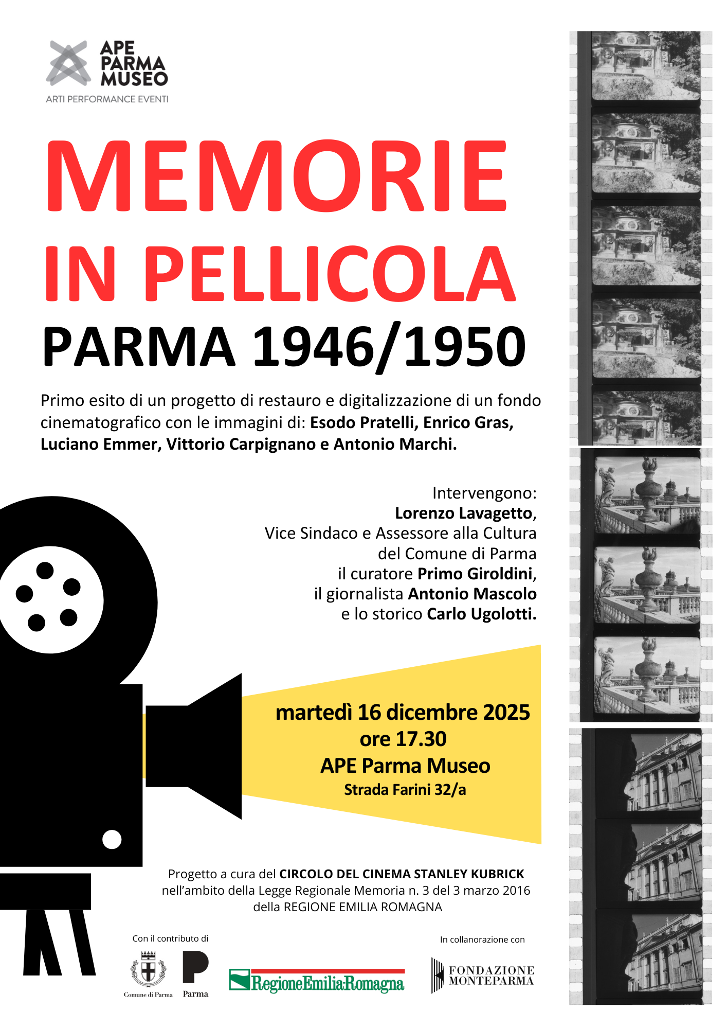 Il progetto promosso dal Circolo del cinema Stanley Kubrick e curato da Primo Giroldini è sostenuto dal Comune di Parma e dalla Regione Emilia-Romagna nell’ambito della legge regionale sulla Memoria.